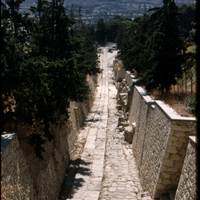 This is a view of a road which has a downward slope and looks out at hills in the distance. On each side of the road is distinguished sets of properties and stone walls. The Royal road leads to the Theatral Area of Knossos. See all items with this value
