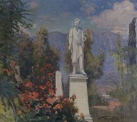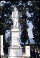 This is a memorial to Lord Byron set within a memorial garden dedicated to the heroes of Greek independence. The sculpture is highly naturalistic and set on top of a large monument with an inscription in Greek. Visitors are seen to the left.