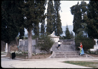 This is a view of the Royal Road leading to the Theatral Area at Knossos. The natural elevation is apparent through the leveling and building of pathways through the terrain. The Theatral Area lies at the end of the Royal Road (as seen in sackett_172) and shows the eastern flight of 18 stairs.