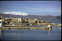 This is a view of the Heraklion port with a snowy mountain in the background.