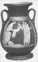 This is a terracotta, red-figure pelike (jar) illustrating the a scene from the story of the Birth of Zeus. Rhea (Zeus' mother and a Titan) is giving a baby Zeus decoy (stone wrapped in cloth) to Cronus (Zeus' father and a Titan) to eat (Cronus ate all of his children so that they would not live to overthrow him). Rhea hid Zeus from Cronos supposedly in the Idaean Cave.
