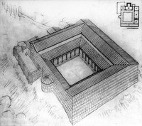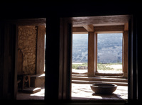 This image of the Throne Room at the ancient site of Knossos shows an interior space with stone walls, and floors, there are also beams holding up the roof and a large basin in the middle of the room. The space is open to the outside hilly terrain and also has benches along the walls and a throne.