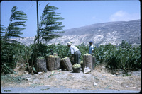 View of two men picking fruits along the side of a possible road, and collecting them in large wooden baskets. This image was taken from a taverna at Knossos.