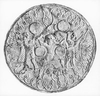 This is a bronze shield depicting Zeus surrounded by the Curetes. He is shown in composite perspective with a long beard, wearing a chiton. He has two animals (lions?) in his hands and his left foot is squashing a miniature bull. The Curetes are next to him with their shields (raised above their heads) and ropes in hand. They are also depicted in composite perspective. All of the figures appear Assyrian stylistically. The shield is outlined with bud motifs (rosettes and leaves) calling back to Archaic pottery.