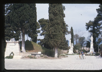 This image shows a man with a camera in the middle of a brick pathway, surrounded by cultivated greenery and several statues, including a statue of Lord Byron at the right. It appears to be a cemetery. There are several obelisk statues in the background, but the closest monument, as well as the focus of the man’s camera in the image, is a large stone trapezoid with fresh wreaths in front of it.