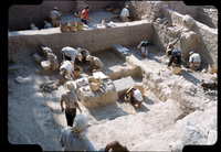 It is an image of the Royal Road excavation at Knossos, with 15 excavators. This image features several partially collapsed walls and a large block.